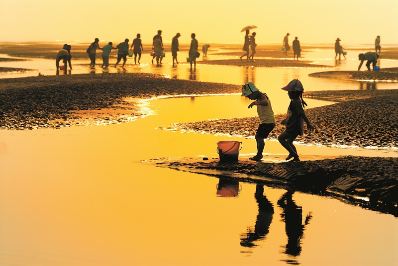 滚滚长江东逝水,浪花退却是沙洲。长江上游带来的泥沙在入海口一带逐渐沉积,形成了大片的沙洲和滩涂。这片南黄海滩涂号称东方第一。大片沙洲茫无涯际、伸向汪洋,潮来烟波浩淼、潮退沃野万顷,蕴藏了丰富的贝类、虾蟹资源,盛产文蛤、西施舌、蛤蜊、毛蚶、沙参(海葵)、泥螺和对虾、梭子蟹等名贵海鲜。你在这里可以钩螃蜞、拾泥螺、踩文蛤、挖沙参、摘紫菜,优美的动作犹如“海上迪斯科”。你也可以尽情欣赏金滩风光、冲浪击水,打沙滩排球、踢沙滩足球、驾沙滩摩托。玩累了搭上帐篷,支起锅灶,来个野炊烧烤,大快朵颐之后枕着阵阵涛声入眠。