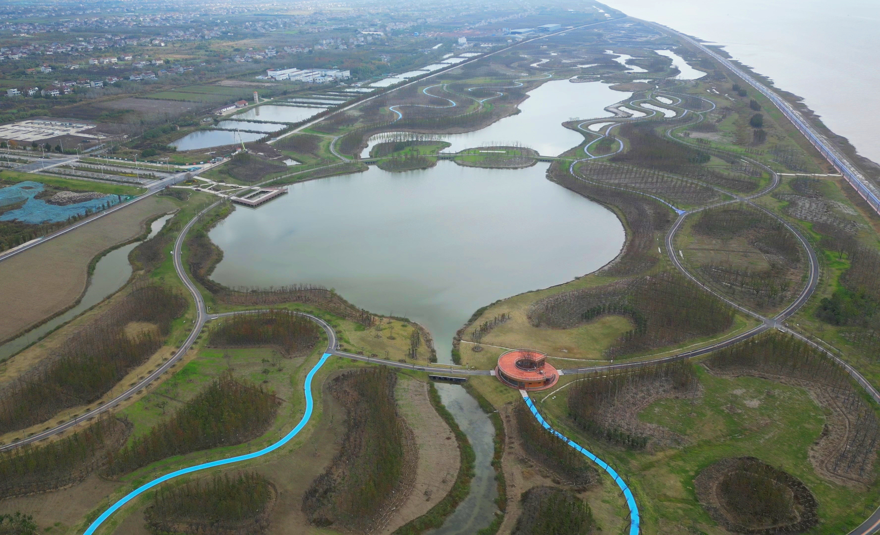 启东市滨江绿廊入口位于江海南路南侧,范围内堤岸长度共计5千米。围绕“重塑江水堤岸,打造滨江阳台”为主题,打造与江海共生的生态保护典范,与城市共融的滨江森林绿廊。依托沿江资源优势,结合“游、乐、赏、文、氧”五大设计策略,以“重塑场地、营造滨江”为主题,打造“一廊、三环、三片、六点”的沿江生态构架,以“日出江海”观江廊道为景观核心轴,“中心环、车行环、堤顶路环”构成绿廊主要框架,森林氧吧区、核心休闲区、湿地涵养区构成三大主题特色片区,“日出江海、长江画廊、湿地画廊、望江台、醉莲香里、沙洲风情”六个景观点,形成滨江骑行、林下穿行、湿地慢行的绿廊特色。